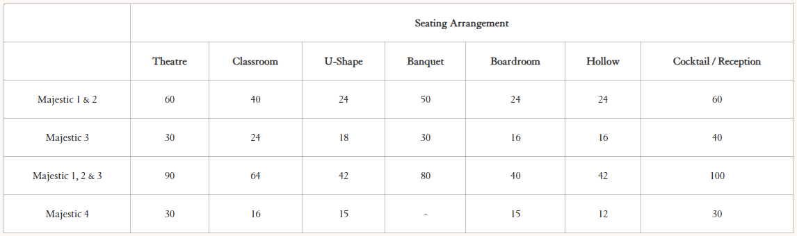 | Theatre | Classroom | U-Shape | Banquet | Boardroom | Hollow | Cocktail / Reception | |||||||||